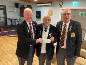 Andrew Melville. Ards Vets President and Secretary presented the VBL with a cheque for £750 towards our nominated Charity, Cancer Fund for Children NI – Andrew explained this was a combination of collections from his Vets Presidential Day, the Men’s President’s Day and the Ladies Presidential day – many thanks to all the members of Ards Bowling Club.
